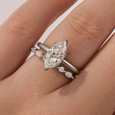 This Moissanite 2.0 carat marquise cut solitaire white gold engagement ring is beautifully complemented by round and marquise accent bands, creating a layered look full of sparkle and dimension. The elongated center stone delivers elegant brilliance, while the mixed-shape accents add a touch of artistry—perfect for someone who appreciates both classic and unique style.