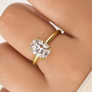 This 2.5 carat cushion-cut moissanite sits at the heart of a rich yellow gold band, creating a look that’s both timeless and fresh. The solitaire design lets the stone’s brilliance shine without distraction, while the smooth band gives a comfortable, elegant feel on the hand.