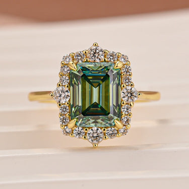 Moissanite 3.0Ct Yellow Gold Halo Emerald Stone Emerald Cut Engagement Ring