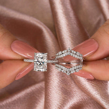 The Moissanite 3.5CT Radiant Cut Insert Wedding Ring Set With Jacket Stack Wedding Band is the perfect blend of opulence and sophistication. Featuring a brilliant 3.5-carat radiant-cut moissanite center stone, the engagement ring sparkles with an incredible fire and radiance that will captivate from every angle. Paired with a delicate, stackable band jacket, this set offers an elevated look with intricate detailing, ensuring a sense of timeless elegance and modern allure.
